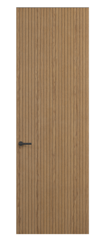 SELECT — коллекция минималистичных дверей с фрезеровкой по натуральному шпону. Рельеф на поверхности полотна создаёт игру света и тени, добавляя пространству динамичности и визуального объёма. Двери SELECT в сочетании со стеновыми панелями и мебельными фасадами, повторяющими лаконичный дизайн, создают единое стилевое решение.